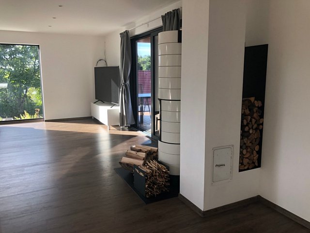 V zastoupení majitele nabízíme nízkoenergetický dům 4+kk o zastavěné ploše 142m2 s terasou 40m2, se zahradou a s pozemkem k výstavbě dvou garáží v obci Hluboké Dvory, okres Brno – venkov. Jedná se o klidnou lokalitu na dosah přírodě s velmi nízkou frekvencí automobilové dopravy. Nabízí se novostavba dřevostavby s důrazem kladeným na kvalitu použitých materiálů a provedených prací. Nepodsklepený přízemní dům je postavený na základové železobetonové desce. Kolaudace RD proběhla v září 2019, na konstrukci domu je záruka 50 let. Elektrické podlahové vytápění je možno ovládat z mobilního telefonu nebo tabletu s vlastním okruhem pro každou místnost, ohřev vody je řešen elektrickým bojlerem o objemu 125 litrů. Dům je připraven pro instalaci elektronického zabezpečovacího systému. Plastová okna s trojskly s velmi nízkou prostupností tepla, celková tepelná ztráta domu činí 4,9 kW. Měsíční náklady tak včetně záloh na energie činí pouze 2500,-. Odpady jsou řešeny vlastní ČOV se vsakováním. Rozlehlý obývací pokoj s kuchyňským koutem, jídelnou a speciálními akumulačními krbovými kamny má výměru 46 m2 je orientován jihozápadně a má vstup na terasu o rozloze 50 m2 s výhledem do zeleně. Většina oken je opatřena venkovními žaluziemi s nastavitelnými lamelami. Dům má další 3 neprůchozí pokoje o rozloze 15, 14 a 12 m2, prostornou koupelnu s velkým sprchovým koutem a samostatné WC s vlastním umyvadlem. V ceně prodávaného domu je kuchyňská linka s vestavěnými spotřebiči jako indukční varná deska Electrolux, parní trouba AEG, myčka AEG, vysoká lednice Samsung a dvou motorová digestoř Siemens, dále velký masivní dubový jídelní stůl, sedací souprava a kvalitní vestavěné skříně na míru v předsíni a v ložnici. Obec Hluboké Dvory je vzdálena 30 km severně od Brna v nadmořské výšce 400 m.n.m. Dojezdová vzdálenost do Brna je 30 minut, do Tišnova 15 minut. Uvolnění domu dohodou. K domu se váže závazek hypotečního úvěru, který bude vyplacen z kupní ceny. Možnost převzetí HÚ. Jedná se o velmi klidné a tiché bydlení. Doporučujeme prohlídku, která je možná na základě předchozí dohody. V případě rychlého jednání domluva na ceně možná.
